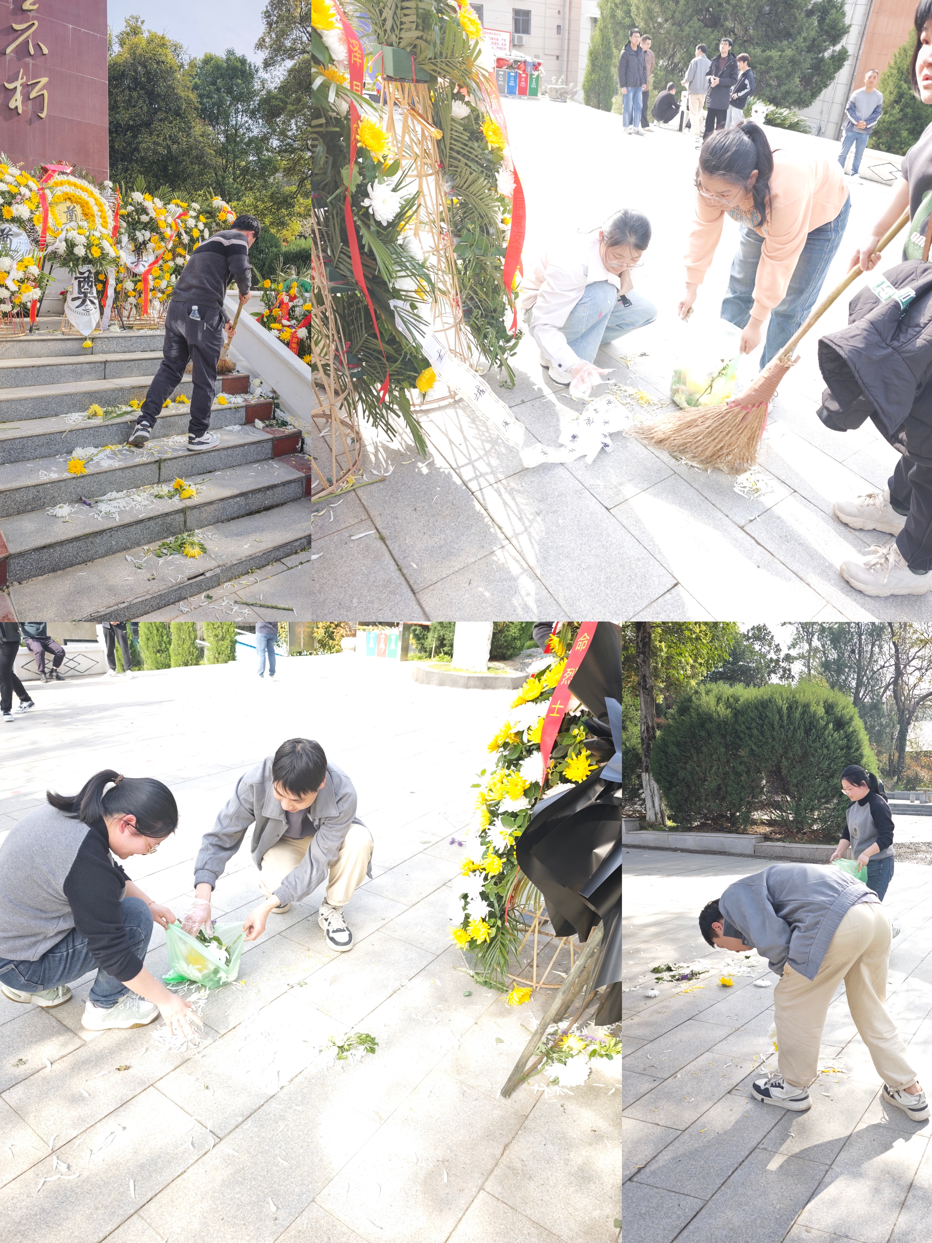 祭掃儀式結(jié)束后,大家化身“志愿守護(hù)者”,在陵園內(nèi)開(kāi)展義務(wù)清掃活動(dòng)。大家手持掃把、垃圾袋,仔細(xì)清理陵園內(nèi)的落花、枯葉、煙頭等雜物,以實(shí)際行動(dòng)維護(hù)烈士陵園的整潔與莊嚴(yán)。經(jīng)過(guò)大家的勞動(dòng),陵園環(huán)境煥然一新,所有人用汗水詮釋了對(duì)革命精神的傳承與踐行。