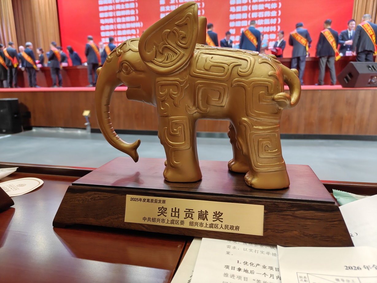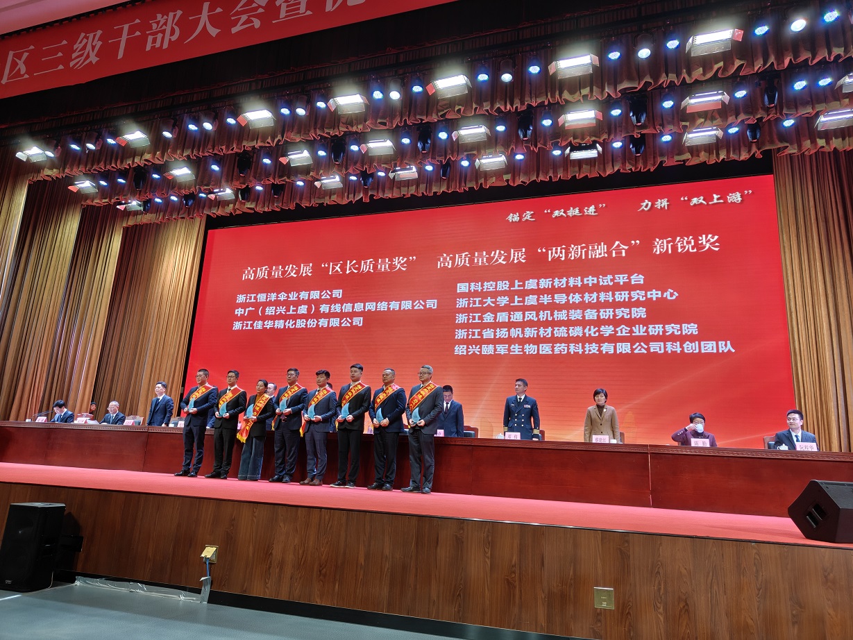 揚(yáng)帆新材料(浙江)股份有限公司樊彬董事長、陶明總裁參會并登臺領(lǐng)獎。公司憑借2025年優(yōu)異表現(xiàn),榮獲2025年度高質(zhì)量發(fā)展突出貢獻(xiàn)獎,樊彬董事長上臺受獎;同時,揚(yáng)帆新材下屬省級企業(yè)研究院斬獲高質(zhì)量發(fā)展“兩新融合”新銳獎,由陶明總裁登臺領(lǐng)獎。